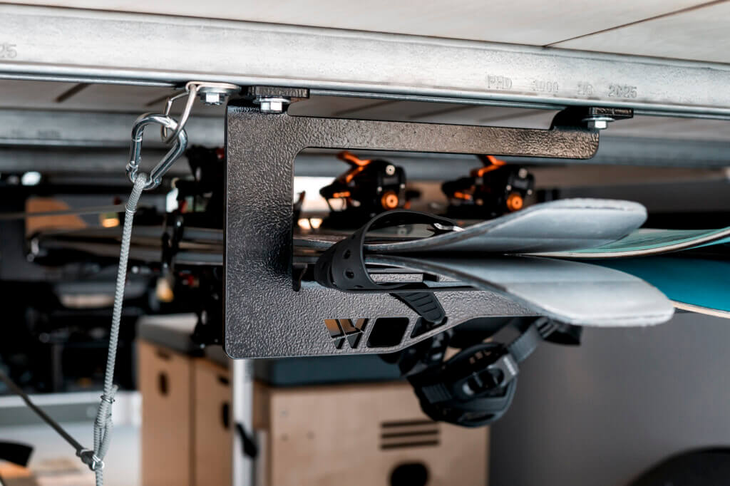 The Under Bed Gear Rack is a modular metal rack that mounts to the underside of your bed platform. It’s designed to securely carry skis, snowboards, and other long gear while keeping it organized and protected, without taking up space in your living area. We built it with winter sports in mind, but it also works great for: