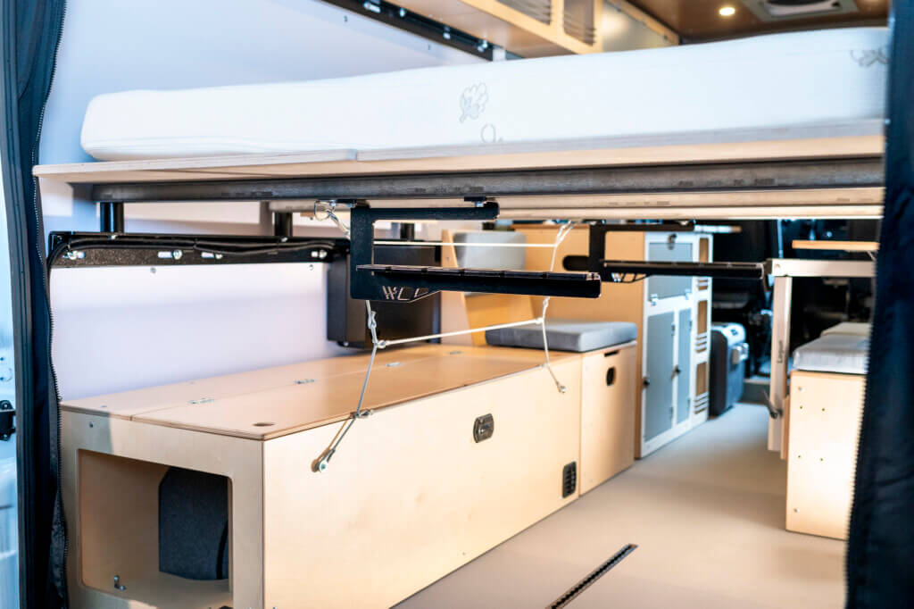 The under bed gear rack is compatible with all standard bed conversions for the RAM ProMaster and Ford Transit vehicles. Note that it is not compatible with the twin bed dinette layout.