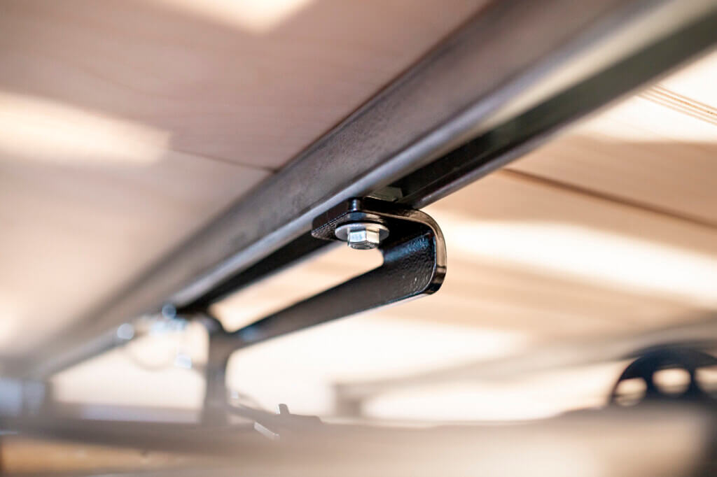The rack mounts directly to the unistrut beneath your bed platform. Installation or removal takes about a minute and just one wrench.